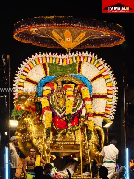 நினைத்தாலே முக்தி தரும் திருவண்ணாமலை கார்த்திகை தீபத்திருவிழா அருள்மிகு அருணாசலேசுவரர் திருக்கோயில் பத்தாம் நாள் இரவு நேற்று (05.12.2025) பஞ்சமூர்த்திகள்- தங்க ரிஷப வாகனத்தில் காட்சியளித்தார்.