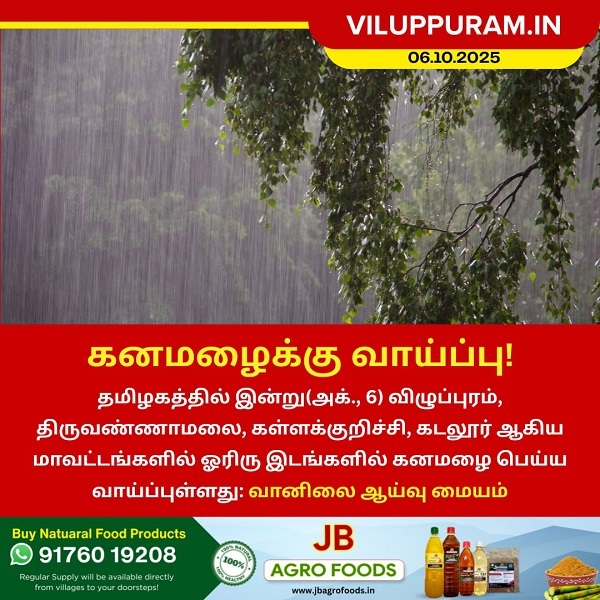 தமிழகத்தில் இன்று(அக்., 6) திருவண்ணாமலை, விழுப்புரம், கள்ளக்குறிச்சி, கடலூர் ஆகிய மாவட்டங்களில் ஓரிரு இடங்களில் கனமழை பெய்ய வாய்ப்புள்ளது என வானிலை ஆய்வு மையம் தகவல்.