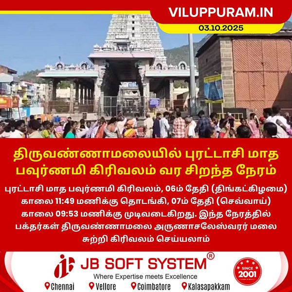 திருவண்ணாமலையில் புரட்டாசி மாத பவுர்ணமி கிரிவலம் வர சிறந்த நேரம் , 06ம் தேதி (திங்கட்கிழமை) காலை 11:49 மணிக்கு தொடங்கி, 07ம் தேதி (செவ்வாய்) காலை 09:53 மணிக்கு முடிவடைகிறது. இந்த நேரத்தில் பக்தர்கள் திருவண்ணாமலை அருணாசலேஸ்வரர் மலை சுற்றி கிரிவலம் செய்யலாம்.