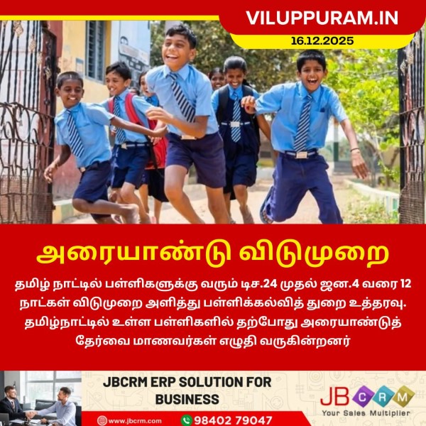 தமிழ் நாட்டில் பள்ளிகளுக்கு வரும் டிச.24 முதல் ஜன.4 வரை 12 நாட்கள் விடுமுறை அளித்து பள்ளிக்கல்வித் துறை உத்தரவு. தமிழ்நாட்டில் உள்ள பள்ளிகளில் தற்போது அரையாண்டுத் தேர்வை மாணவர்கள் எழுதி வருகின்றனர்