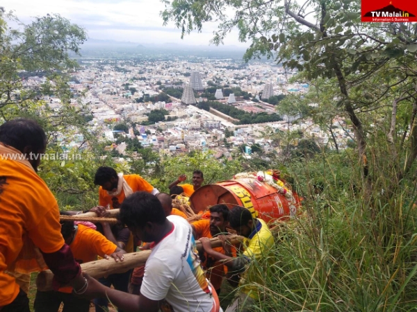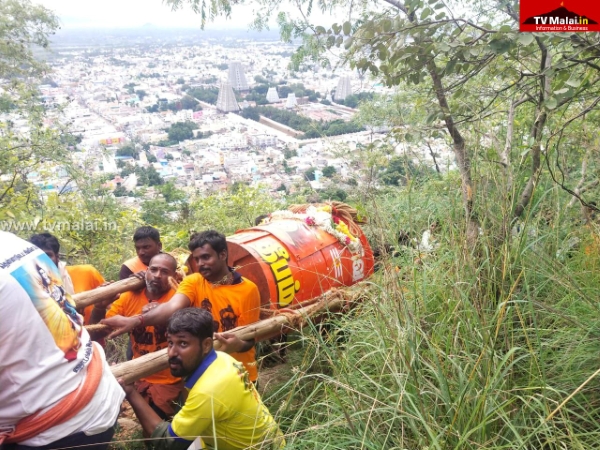 திருவண்ணாமலையில் ஆண்டுதோறும் நடைபெறும் கார்த்திகை மகா தீபத்திருவிழா 2025 முன்னிட்டு, அண்ணாமலையார் மகா தீபத்திற்காக பக்தர்கள் பெரிய அளவிலான கொப்பரையும் நெய்யையும் மலையில் ஏற்றும் காட்சி.