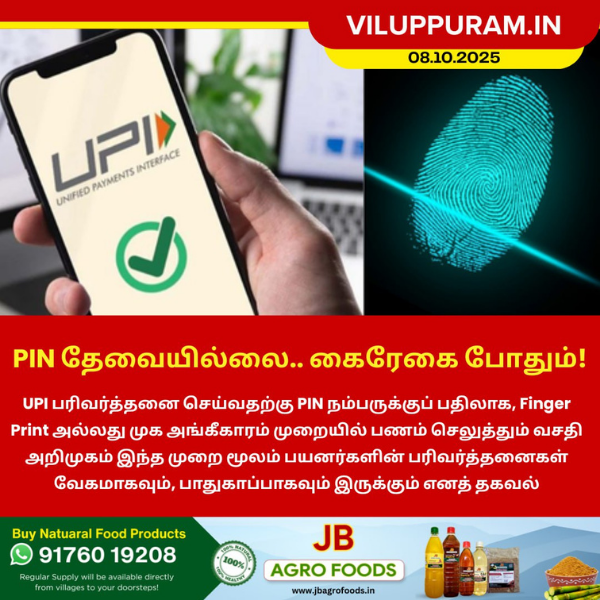 UPI பரிவர்த்தனை செய்வதற்கு PIN நம்பருக்குப் பதிலாக, Finger Print அல்லது முக அங்கீகாரம் முறையில் பணம் செலுத்தும் வசதி அறிமுகம் இந்த முறை மூலம் பயனர்களின் பரிவர்த்தனைகள் வேகமாகவும், பாதுகாப்பாகவும் இருக்கும் எனத் தகவல்